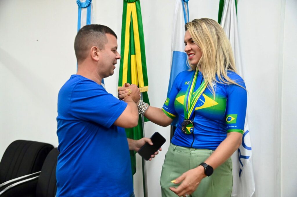Prefeito Luiz Furlani recebeu a ciclista Flávia Real e a parabenizou pela conquista - Foto: Gabriel Borges